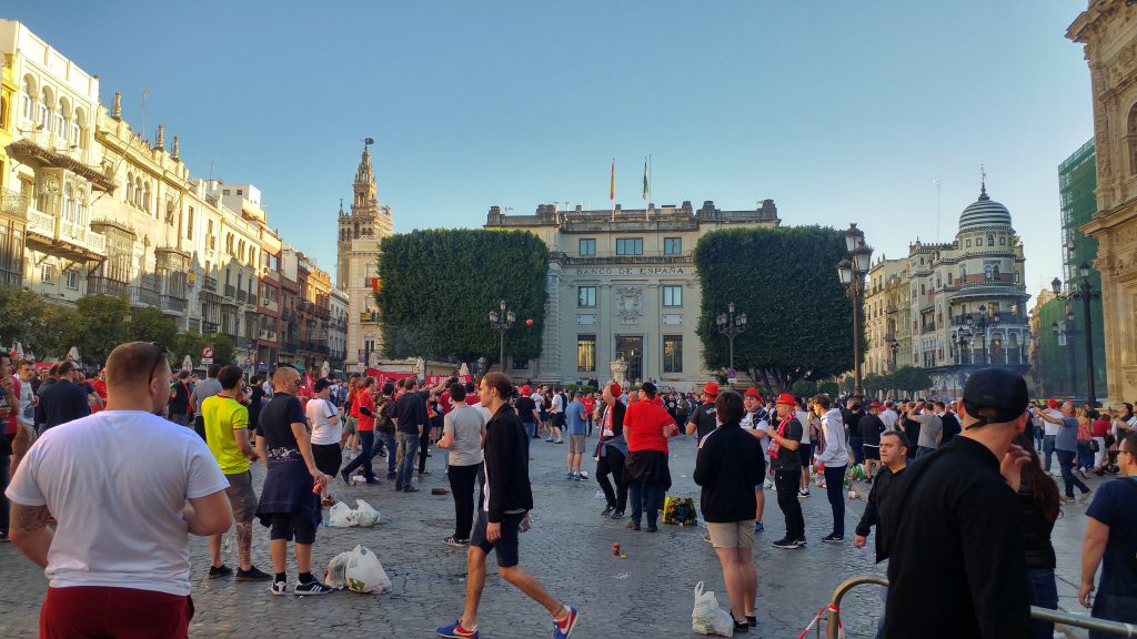 Pour en revenir à nos moutons ou plutôt nos oranges vu la destination, c’est donc de bonne heure le mardi matin, jour du match, que nous décollons de Genève à destination de Malaga et retrouvons par la même occasion une connaissance de nos fréquents déplacements à Anfield ou en Europe, avec qui du coup nous ferons le voyage aller et retour. Arrivés à Malaga en fin de matinée, c’est parti pour quelques heures de train afin de rejoindre Séville finalement en milieu d’après-midi. Rapide passage à l’hôtel pour déposer les affaires, enlever une couche d’habits vu la météo plus qu’agréable dans cette région et partir à la recherche d’un endroit où profiter de l’avant match en buvant quelques pintes et en chantant à la gloire de notre club avec les nombreux Reds sur place. Il faut avouer que bières et tapas, en t-shirt sous le soleil et avec en fond sonore les chants des Reds, ça fait plaisir.
